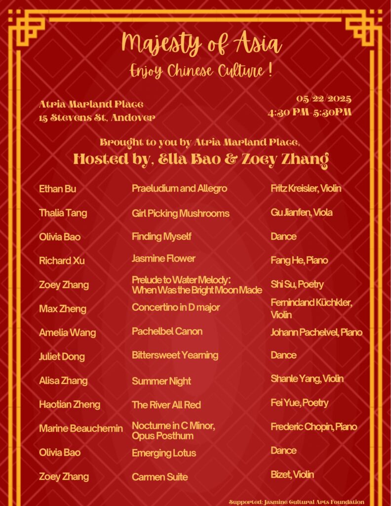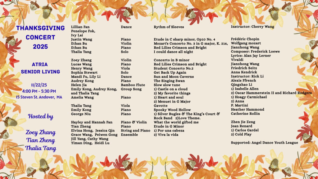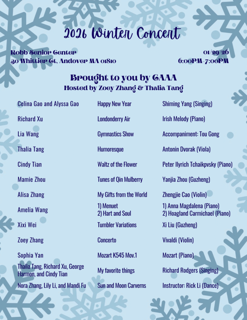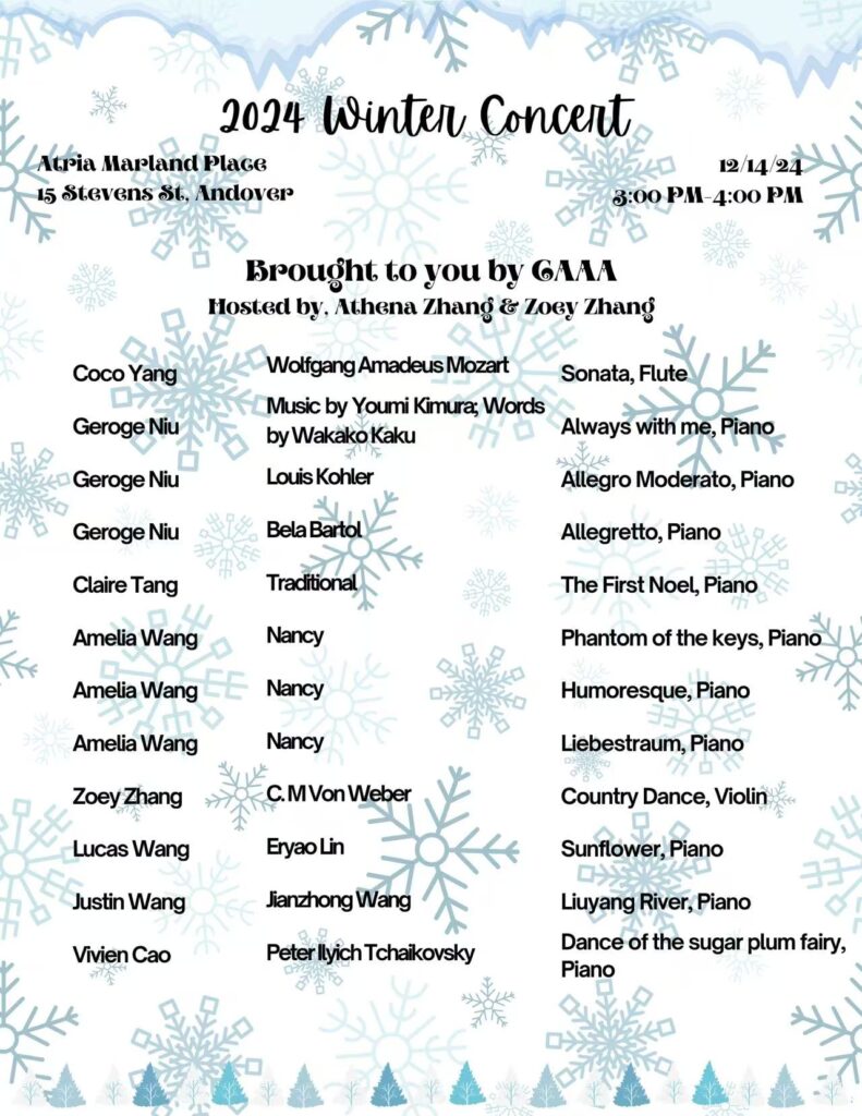 I coordinate and present concerts for two senior centers in Andover—the Atria Marland Place and the Robb Senior Center—and in the process, I have learned the importance of responsibility, communication, and empathy as I engage with senior residents. These concerts have also provided them with an opportunity to share in music.